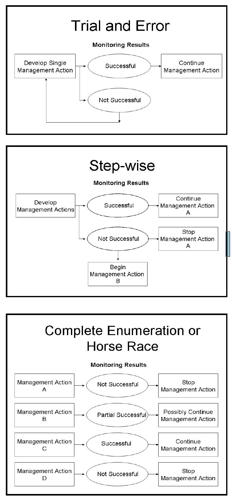 Implementation involves following through with management and conservation actions on the landscape. From workshop and management planning efforts, either a single or suite of management actions will be developed. In a learning-modeling framework there are 3 ways to approach management alternatives. Each has differing costs in both time and money. These approaches are Trial and Error, Stepwise, and Complete Enumeration or the Horse Race approach (Figure 35). Trial and Error is a single step approach that is usually the least expensive method but can take substantially longer to evaluate programs with many alternatives for delivery. Stepwise is similar in cost to Trial and Error but can switch to an alternative without revisiting the planning process. Time is saved and monetary costs include the additional planning for alternatives. The Horse Race is the most efficient way to compare a suite of alternatives, but it can be prohibitive to implement and monitor all reasonable alternatives simultaneously. The approach best suited for each individual program or action will be used depending on logistics and budgets.